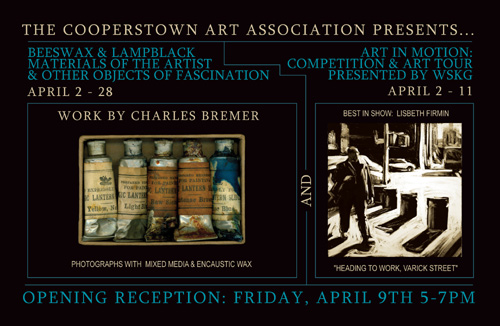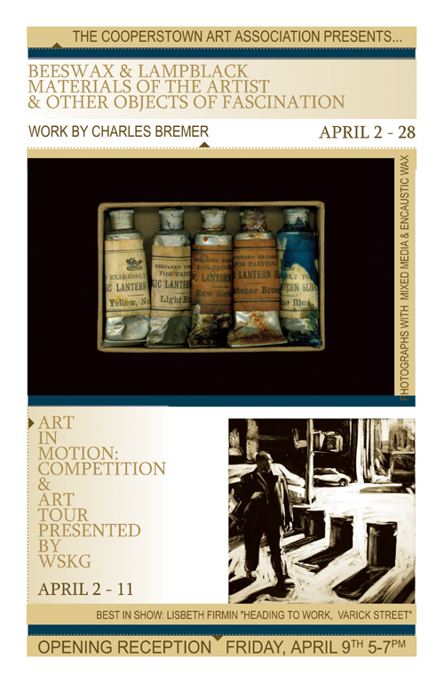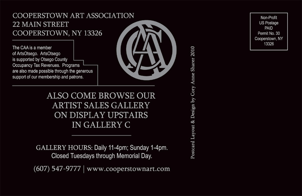 | These are several versions of a promotional exhibition flyer for two exhibits at the Cooperstown Art Association: a solo show by Charles Bremer and a traveling exhibit sponsored by WSKG. I started working with only samples of the artist's work and titles, and was responsible for developing the visual concept for the overall card as well as adhering to bulk mailing guidelines. I also applied this design to create emails, ads, website graphics, signage & social media promotion.