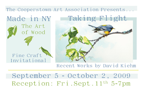 | This is an promotional exhibition flyer for two exhibits at the Cooperstown Art Association: Made in New York: Fine Craft Invitational & a solo show by David Kiehm. I started working with only samples of the artist's work and titles, and was responsible for developing the visual concept for the overall card as well as adhering to bulk mailing guidelines. My goal was to combine themes and artwork from these various shows and reach a cohesive, elegant arrangement. I also applied this design to create emails, ads, website graphics, signage & social media promotion.