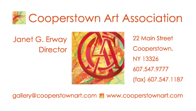 | These are re-imagined logos for the Cooperstown Art Association. The green logo is for use on recycled projects and papers the gallery uses and involves the organization acronym. The painted square utilizes the original logo but adds a fresh and creative backdrop. They consist of my original vector artwork which I created in Adobe Illustrator and Photoshop. I also applied this design to create emails, ads, printed materials, business cards, website graphics, signage & social media promotion.