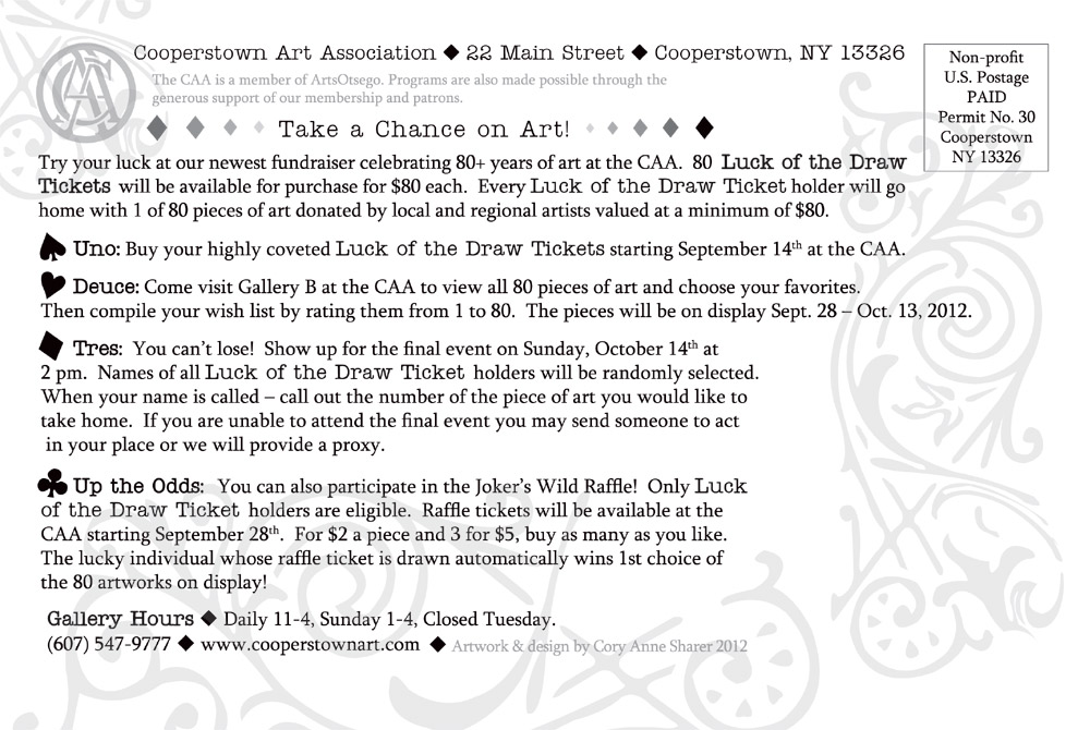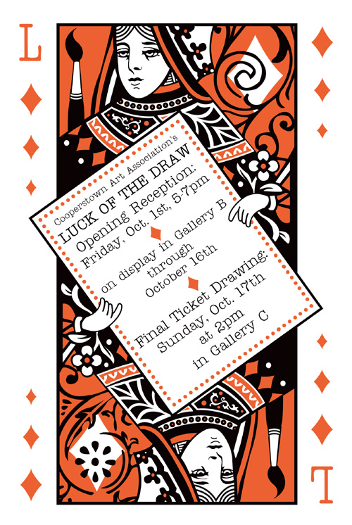 | This project is made up of promotional material I developed for Luck of the Draw, an exhibit and fundraiser at the Cooperstown Art Association. I developed the visual concept and theme for every aspect of the fundraiser and here you will find the print materials. They consist of my original vector artwork created in Adobe Illustrator and Photoshop. I chose the visual theme of palying cards because I intended these materials to be fun, playful and engaging, as well as relating to the title "Luck of the Draw." I also applied this design to create emails, ads, website graphics, posters, tickets, an exhibition listing, signage & social media promotion.