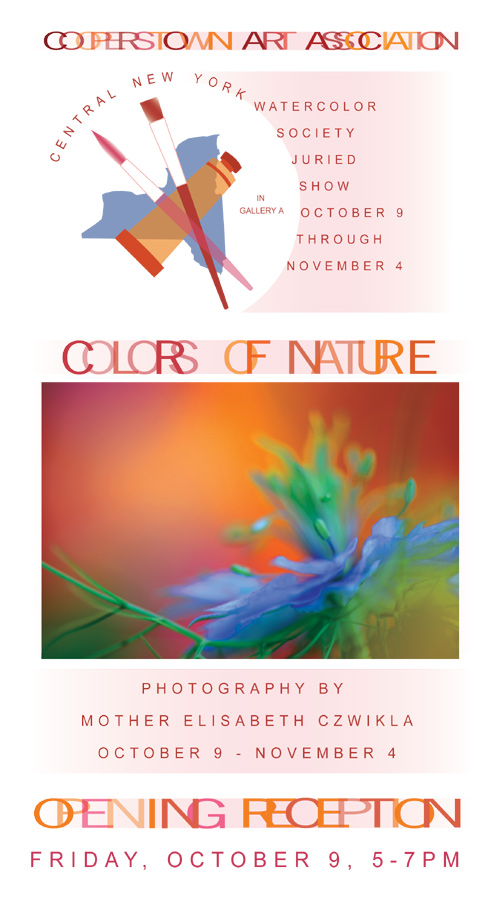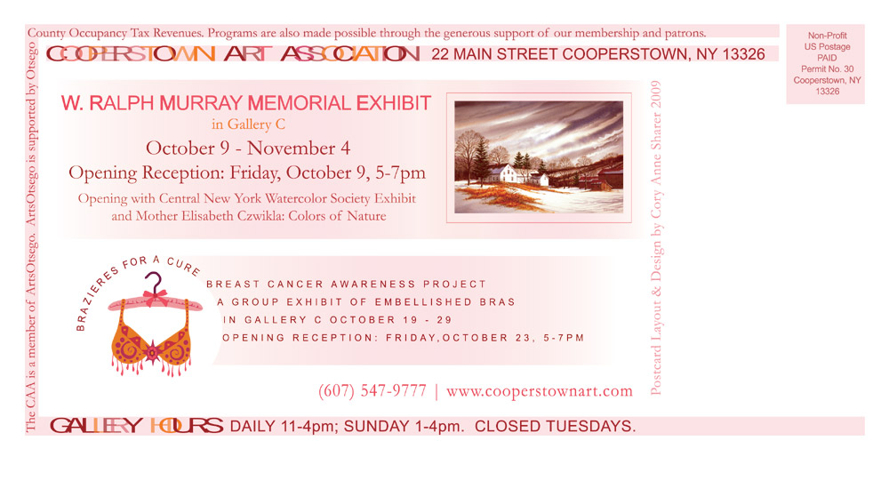 | This is a promotional exhibition flyer for four exhibits at the Cooperstown Art Association: The Central New York Watercolor Society, a solo show of photography by Mother Elisabeth Czwikla, a memorial show of W. Ralph Murray and the breast cancer awareness project: Brazieres For A Cure. I started working with only samples of the artist's work and their titles, and was responsible for developing the visual concept for the overall card as well as adhering to bulk mailing guidelines. My goal was to combine logos and artwork from these various shows and reach a cohesive, elegant arrangement. I also applied this design to create emails, ads, website graphics, signage & social media promotion.
