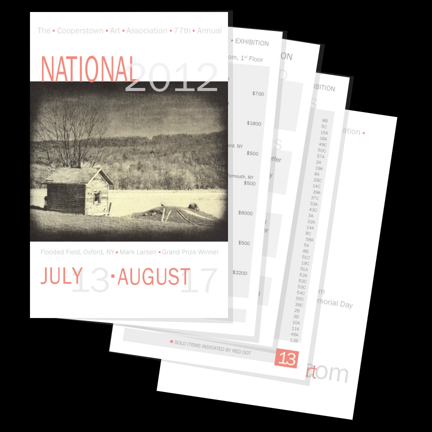 | This project is made up of promotional material I developed for the National Juried Exhibition at the Cooperstown Art Association. I developed the visual concept and theme for every aspect of the exhibit and here you will find the print materials. They include the artist application form, which employs an insert with dates and juror information (in order to make the outside brochure usable year after year), the exhibition mailer, the exhibition poster which features all the artwork in the show and the exhibition signage. They consist of my original vector artwork created in Adobe Illustrator and Photoshop. I also applied this design to create emails, ads, website graphics, an exhibition catalog,signage & social media promotion.