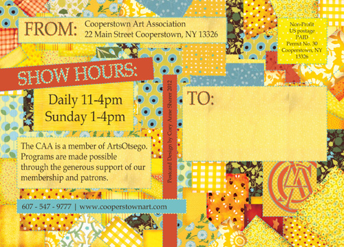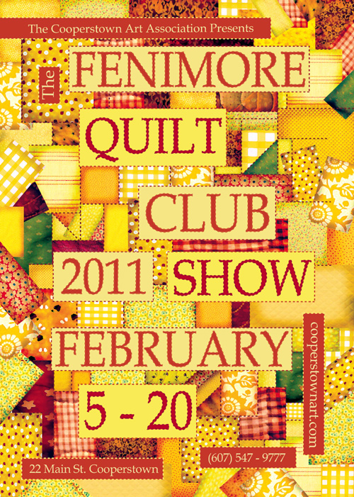 | This project is made up of promotional material I developed for the Fenimore Quilt Club Show, an annual exhibit and at the Cooperstown Art Association. I developed the visual concept and theme for all of the show materials. I took and collected photographs of quilt pattern close ups from previous years and arranged them into a "digital quilt" created in Adobe Illustrator and Photoshop. I also applied this design to create emails, ads, website graphics, programs, signage & social media promotion.