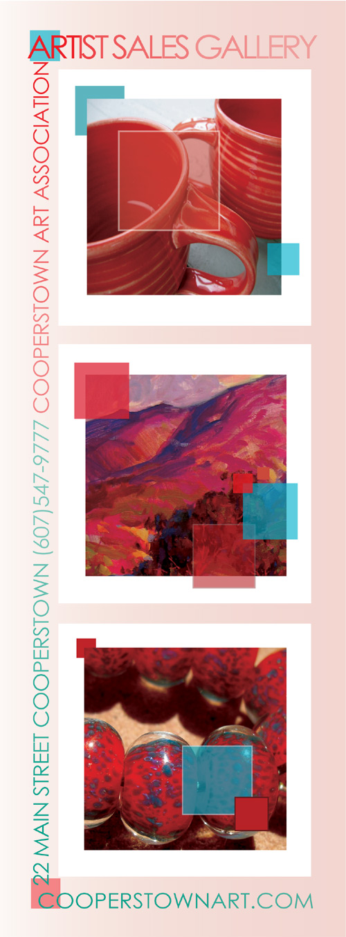 | This is an promotional exhibition flyer for the artist sales gallery at the Cooperstown Art Association. I started working with only samples of the artist's work hoping to show the variety of products offered, and was responsible for developing the visual concept for the overall card. I also applied this design to create emails, ads, website graphics, signage & social media promotion.