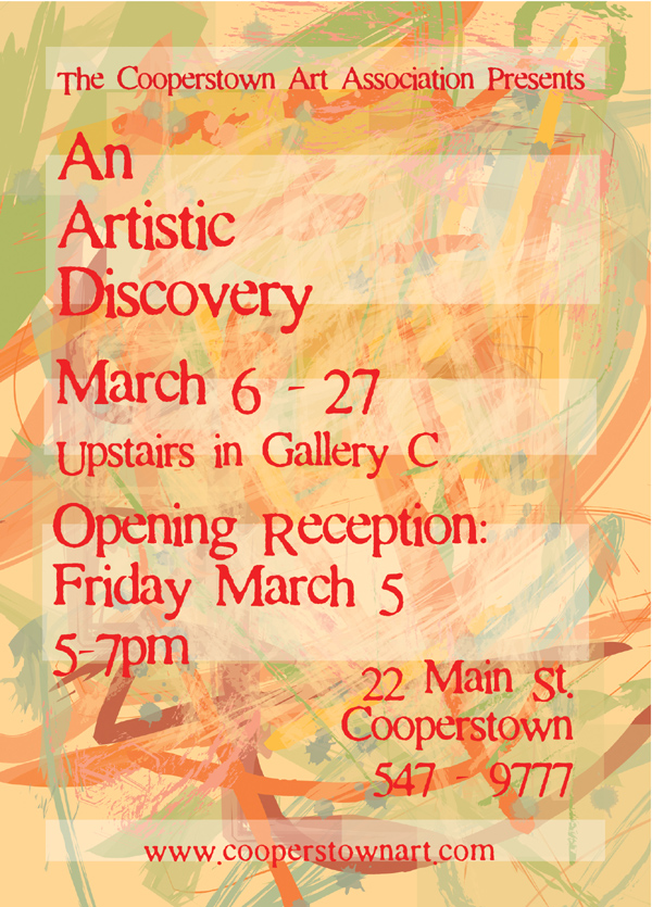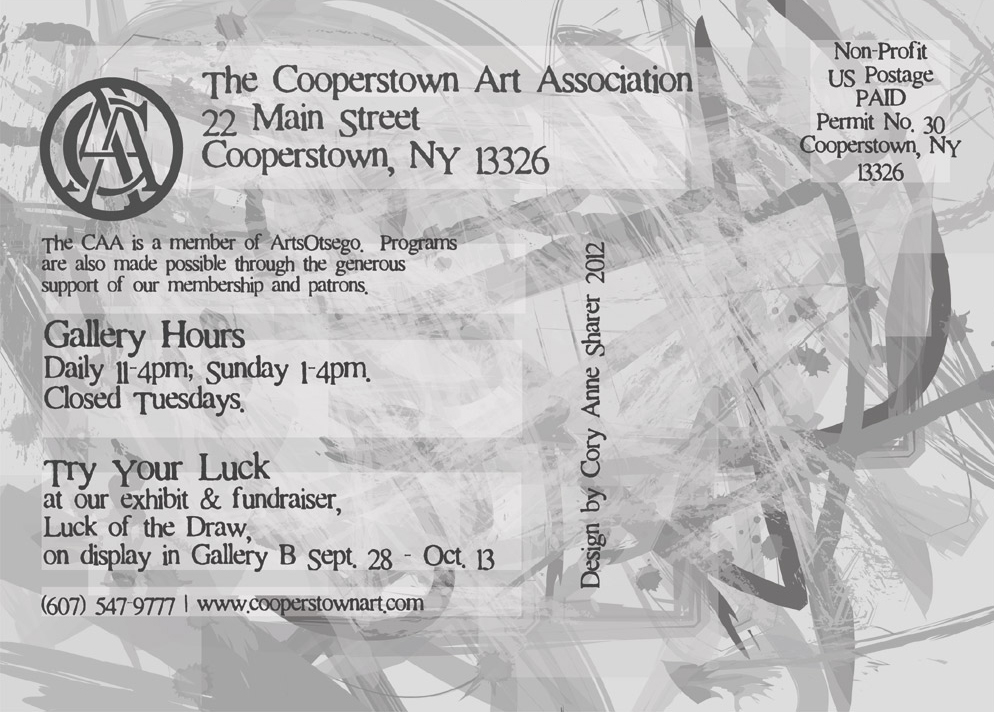 | This is an promotional exhibition flyer for two exhibits at the Cooperstown Art Association: Those Who Can: Art Teachers Past & Present and The Central New York Watercolor Society Exhibit. I started working with only the titles, and was responsible for developing the visual concept for the overall card as well as adhering to bulk mailing guidelines. Painting was done digitally in adobe illustrator. I also applied this design to create emails, ads, the exhibition catalog, website graphics, signage & social media promotion.