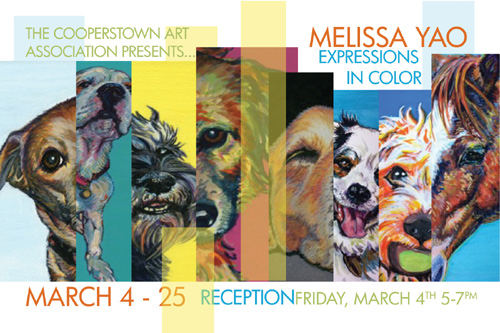 | This is an promotional exhibition flyer for an exhibit at the Cooperstown Art Association: a solo show by Melissa Yao. I started working with only samples of the artist's work and her title, and was responsible for developing the visual concept for the overall card as well as adhering to bulk mailing guidelines. I also applied this design to create emails, ads, website graphics, signage & social media promotion.